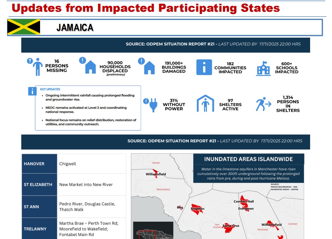 Three weeks after Hurricane Melissa descended on Jamaica, new details have emerged that demonstrate the impact of the Category Five hurricane on the island. In a situation report released by the Caribbean Disaster Emergency Management Agency (CDEMA) on Friday, some 90,000 households have been displaced, 191,000 buildings damaged, 182 communities and more than 600 schools affected. These numbers are likely to change in the coming weeks as assessment and relief efforts continue.