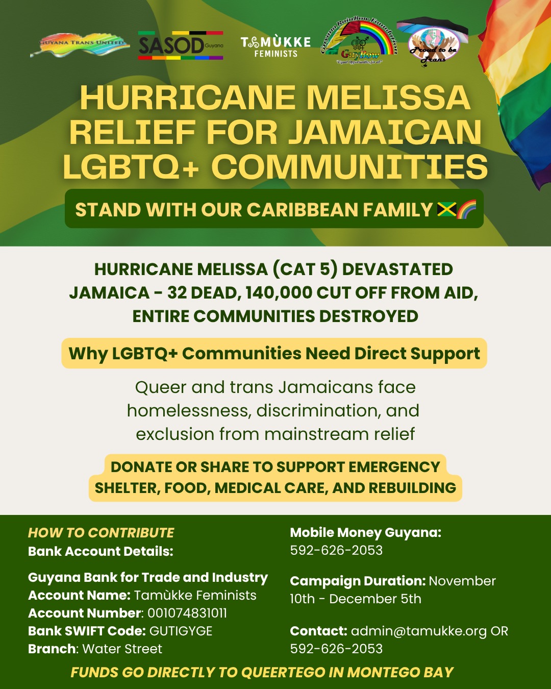 The call for funds to aid relief was launched on November 10th by Guyana Trans United, Proud to be Trans, Guyana Rainbow Foundation, Society Against Sexual Orientation Discrimination, and Tamùkke Feminists. These funds will go towards priority items, a spokesperson for the organisations told us, “We are raising cash with different donation tiers: $5,000 provides emergency food supplies; $10,000 covers temporary safe shelter; $20,000 provides comprehensive emergency support; $50,000 helps rebuild housing for one survivor; $100,000 supports long-term recovery for multiple people”.