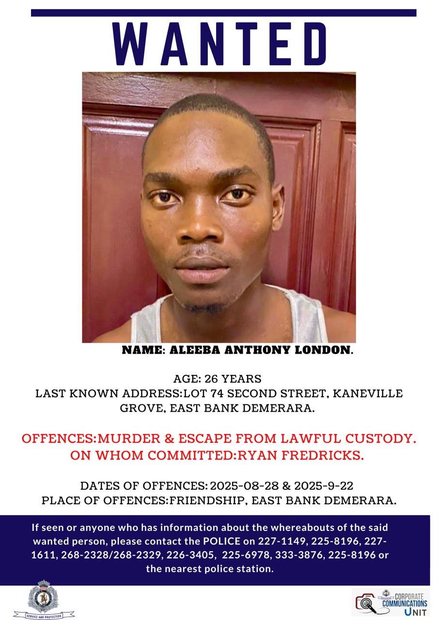 The Guyana Police Force on Monday issued a wanted bulletin for 26-year-old Aleeba London, who is wanted for murder and escaping lawful custody.
